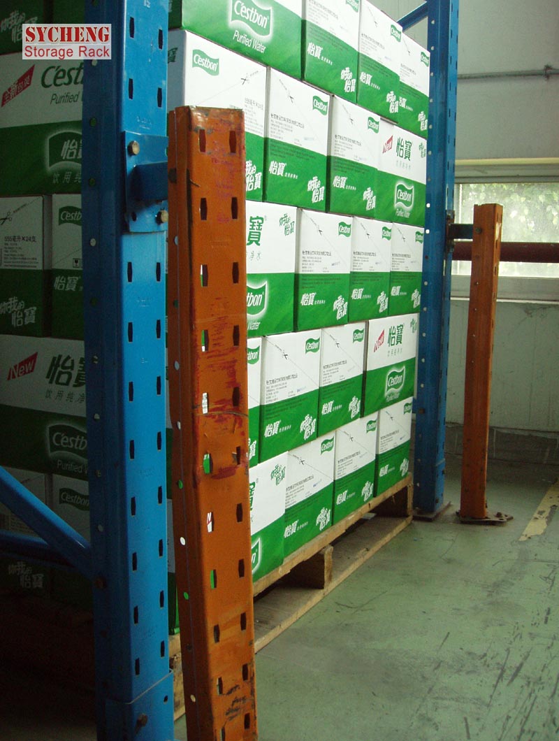 因為所有的貨物都是擺放在通廊式貨架的牛腿擱板上面的,托盤是按照深度方向來存放的,貨物存取從貨架同一側(cè)進出,貨物先存后取、后存先取,遵循“先進后出”的原則,叉車可方便的駛?cè)胴浖苤虚g存取貨物。由于整個叉車在貨架里面,只要是一個不留神就會容易碰撞到左右的貨物,因此叉車駕駛者必須要格外的小心。